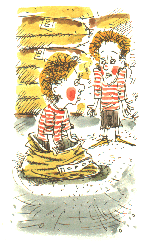 Близнецы развязывают мешок, вылезает Шпион с косыми глазами. Ему дают два яйца.