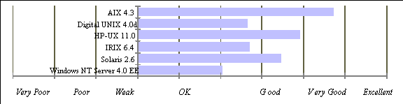 AIX 4.3 лидирует в сетевых возможностях Internet/intranet обеспечивая широчайший набор расширений TCP/IP, а также выигрывая за счет поставляемого с системой Notes сервера. Digital UNIX занимает второе место с сильными возможностями сетевой безопасности, включающий не только возможности Web-броузинга, но и средства Web-авторизации, с Navigator Gold, и целым набором расширений TCP/IP. Однако, Digital UNIX не содержит новых возможностей NFS таких как CacheFS и AutoFS. IRIX 6.4 идет третьим, включая CacheFS и AutoFS, и возможности сетевой безопасности не хуже, чем у Digital. Но IRIX не содержит network time facilities (NTP) и такие TCP/IP возможности как IPv6 и IPSec. Следующий - Sun, с хорошей поддержкой NFS и вторым местом за набор TCP/IP расширений. Однако, Sun полагается на свой Web сервер, а не на Netscape, Microsoft или Apache, и уступает в средствах авторизации и таких важных службах как служба каталогов Novell NDS. HP обеспечивает сильную поддержку Internet в своем HP-UX, проявляющуюся в передовых функциях Internet протокола и сетевой безопасности, правда опаздывая с поддержкой таких функций для NFS. HP-UX, вместе с AIX, также лидируют в поддержке NDS. Microsoft NT 4.0 же, обеспечивает поддержку Internet/intranet, которую в целом можно охарактеризовать как "хорошую". NT уступает ведущим производителям UNIX из-за плохой поддержки службы каталогов, сетевой безопасности, NFS, и небольшого количества TCP/IP расширений. Microsoft фокусирует свои усилия на встроенном Web сервере и на настройке Java Virtual Machine.