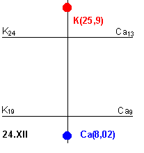 "K"=19mg%-24mg%, для "Ca"=9mg%-13mg%. Таким образом, 19mg% "K" соответствует