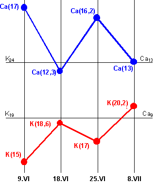 13.VI - Анализ сыворотки крови: "K"=17mg%; "Ca"=9,9mg%.
