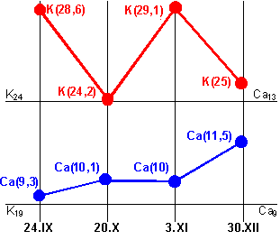 Произведенные в это время определения "K" и "Ca" показали следующее: